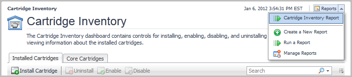 To obtain a full list of the cartridges installed on the Management Server, open the Cartridge Inventory dashboard (Administration > Cartridges > Cartridge Inventory), and select Cartridge Inventory Report from the Reports menu.
