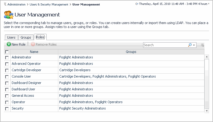 A Foglight user has a user name and a password and can belong to one or more groups. A user account has access to all the roles associated with the groups the user belongs to, and any additional roles associated with that account. Logging in to Foglight as a specific user authorizes you to perform a certain set of actions, based on the roles that are associated with that user account. Foglight can store user passwords on the Management Server, or in an external directory.