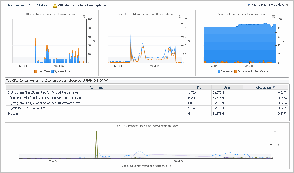 CPU Details (example shown below): use it to identify the top CPU consumers on the host, see the top processes’ utilization trends, and view charts for CPU utilization process load.