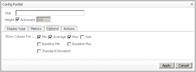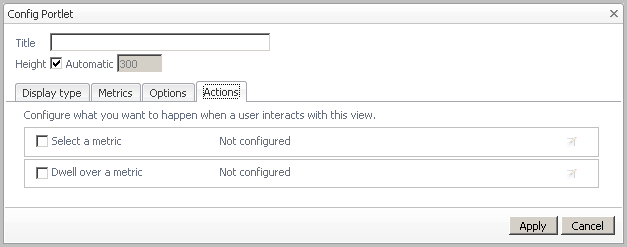 After you have set the initial settings based on “Creating a Custom Dashboard” in the Foglight® User Help and selected the layout position as fixed position, you can configure the portlet for additional views such as the display type of views, select metric labels, configure view settings, and choose the action when a user selects or dwells over a metric.