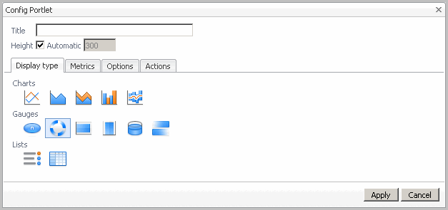 The Display type tab contains options for selecting the visual layout according to a chart type, gauge type, or list type. For more information on the display types available and their settings, see Options tab .