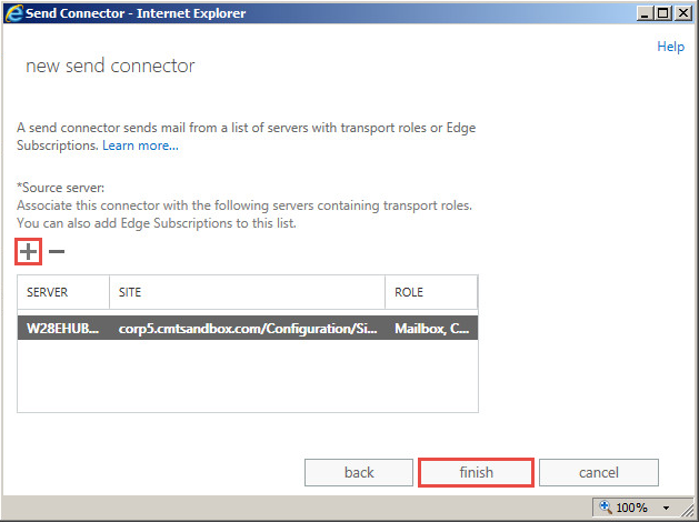 10. On the A send connector sends mail from a list of servers… screen, fill out the form as follows: