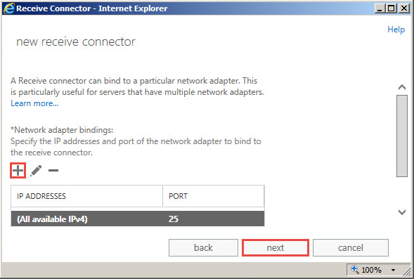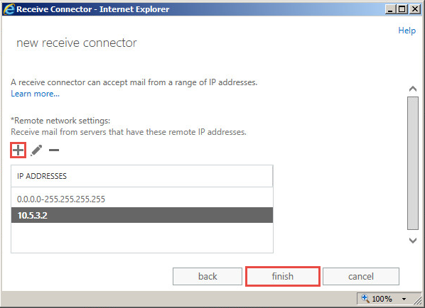 7. In the A receive connector can accept mail… window, under Remote network settings, click the plus sign (+)
