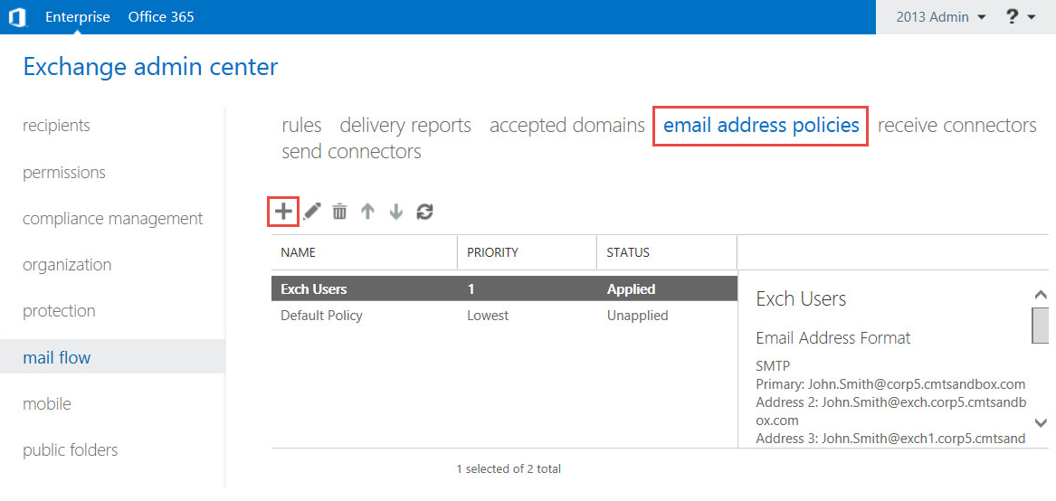 The default address policies that will get stamped on each Exchange user as they are provisioned have successfully been created. The default address policies will ensure that proper namespace and aliases are created in Exchange for mail routing purposes.