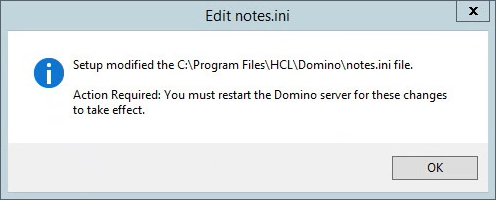 10. An informational message appears if Let Setup modify the notes.ini file was selected; click OK. Be sure to restart the Domino server for the changes to take effect: