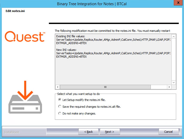 9. On the Edit notes.ini screen, select to modify the notes.ini file, save the required changes to a notes.ini alt file, or select to not make any changes to the notes.ini file; click Next. These changes must be made to the Notes.ini for Integration for Notes BTCal to run: