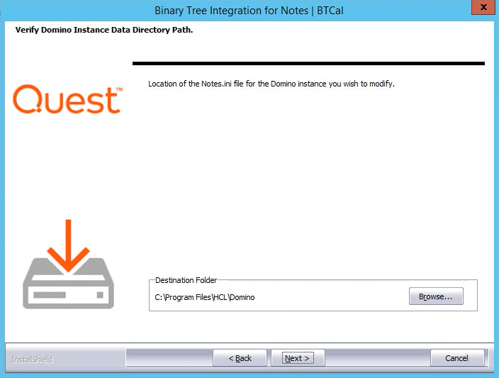 5. On the Verify Domino Instance Data Directory Path screen, browse to the location of the Notes.ini file that will be modified for the Domino instance; click Next: