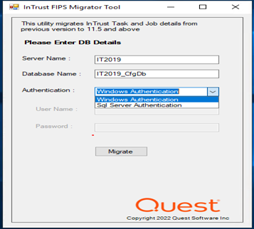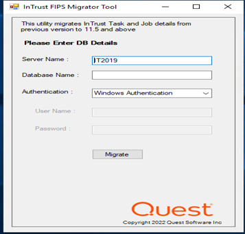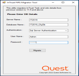 3. Launch InTrustFIPSMigratorTool.exe tool with local admin privilege and the SQL login having SQL admin privilege.