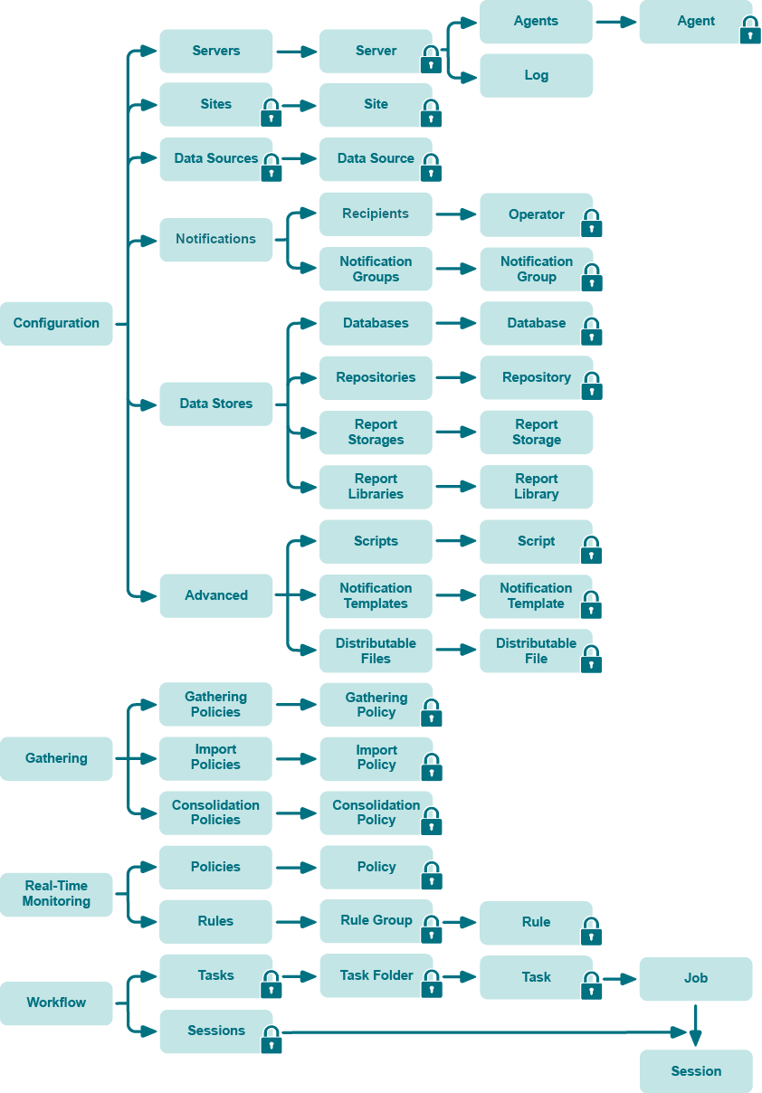 The following figure illustrates the inheritance of security permissions of InTrust configuration objects available in the InTrust Manager snap-in. Containers are shown as folders. The lock icon means that you can edit security settings of the marked object using the Security tab in its properties dialog box.