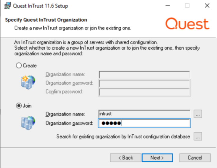 1. While Installing 11.6.0 full suite or Individual server msi, select “join” and click on “Search for existing organization by InTrust configuration database”