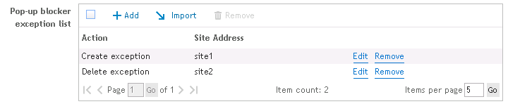 Selecting the option, Turn on the pop-up blocker, will enable the pop-up blocker exception list. The pop-up blocker allows for certain URLs to ignore the pop-up blocker.