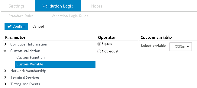 If the variable does not result in a Boolean value and will be used as comparison to a string, the variable must be wrapped within quotes. In the following example, $SiDesktopSize, the variable results in the size of the computer desktop as a string. For example, "1024x768". This variable is expressed within quotes and compared to a string (within quotes) in the Validation Logic dialog.