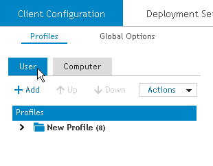To create a profile, first choose either the User or Computer tab. Select the level of the profile tree where the profile will be created. For a parent or top level profile, select the Profiles level in the tree. For a child profile, select the parent profile it will be created within. Next click the Actions drop list and select Add. A new profile will be created at the level you selected. It will be temporarily named New Profile. Type over the profile name and give it a more meaningful name. You can then expand the profile to reveal the profile objects.