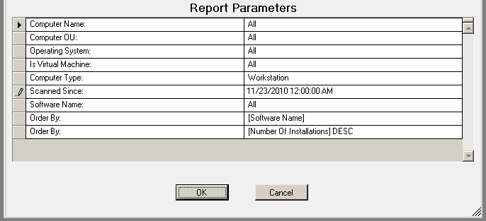 The Software Inventory - Total Installations report prompts the user for the Report Date to include Computer Name, Computer OU, Virtual Machine type, Scanned Since and Software Name.