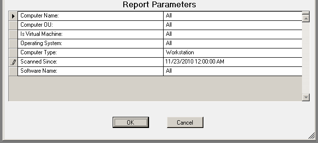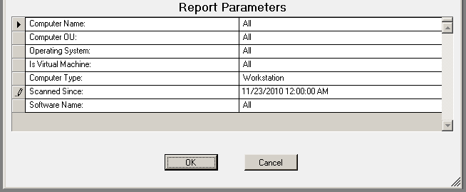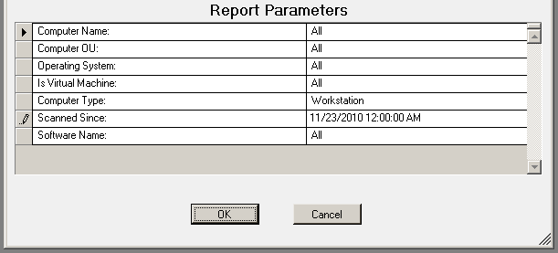 The Software Inventory report prompts the user for the Computer Name, Computer OU, Virtual Machine type, Scanned Since date and Software Name.