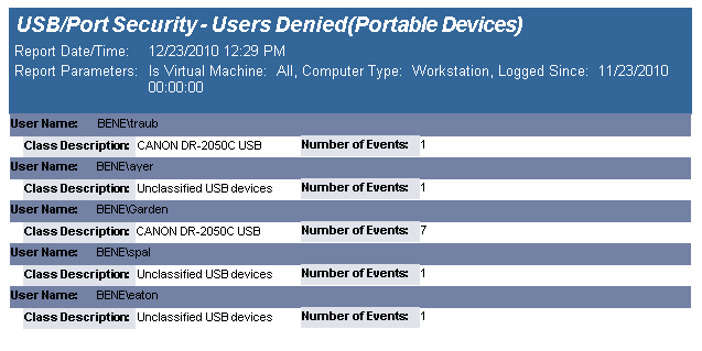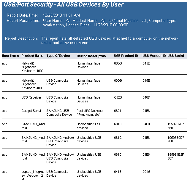 The USB-Port Security - All USB Devices by User report reports on data collected about all USB devices used on the network and are within the report parameters.