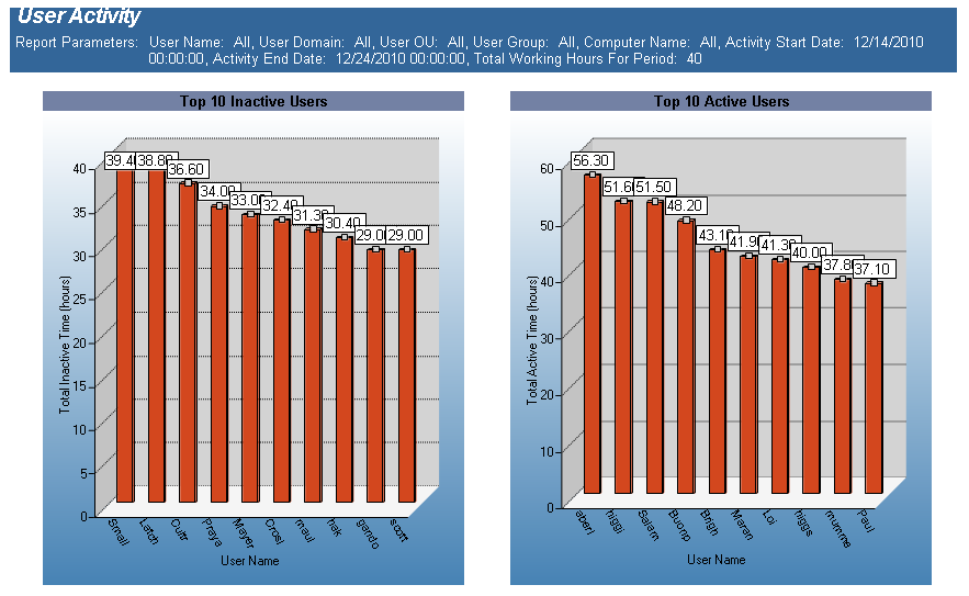 The User Activity Per Computer - Summary Page report displays, graphically, the top 10 inactive users and top 10 active users. Total active and inactive session times are calculated. Total active time per session is the time between logon or unlock to lock or logoff.  Total inactive time is (total working hours for the time period) (total active time for the time period).