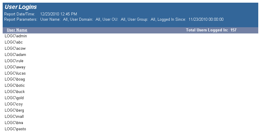 The User Logins report details user logins across the enterprise. This report can be used to sum the number of logins per User Name, Domain, OU, or Group based on the date the user last logged in.