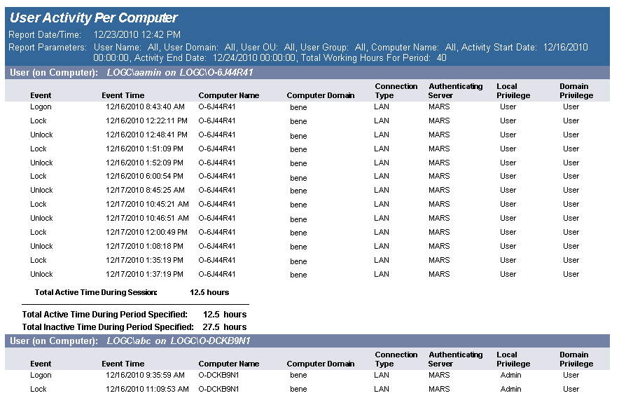 The User Activity Per Computer report details user activity on each computer that the user has logged on to and tallies active time for each computer. Total active and inactive session times are calculated. Total active time per session is the time between logon or unlock to lock or logoff.  Total inactive time is (total working hours for the time period) (total active time for the time period).