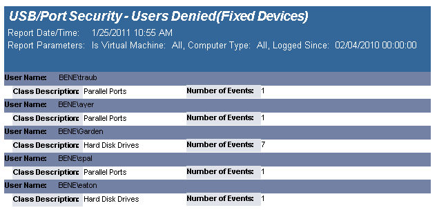 The USB-Port Security - Users Denied (Fixed Devices) report reports on data collected about Users that generated denied and/or disabled device events. The report is grouped by User Domain, User Name, Class Description and Device Description.