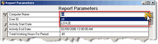 A parameter with the name of '<%DateToday-7|Activity Start Date: |12/24/2005|D%>' will show up as 11/24/2005 (given the current date of 12/1/2005) and '<%DateToday-0|Activity End Date: |12/31/2005|D%>' will show up as 12/1/2005 (given the current date of 12/1/2005). Notice that the report parameters default values are ignored when the DateToday parameter name is used.
