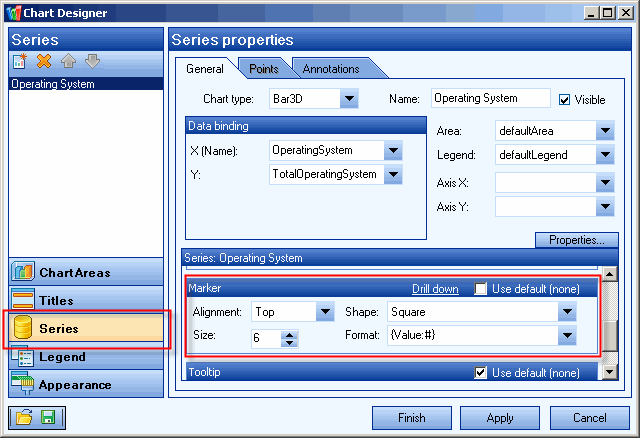 To add markers to a chart first add the chart control to the report. Right click on the report and choose customize from the context menu. The Chart Designer will display. Select the Series menu. In the series section of the dialog, scroll down to the marker section. Clear the Use default box.  Set the appropriate alignment, shape, size and format.
