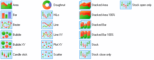 Renders a chart on the report. The Chart control supports many different types of charts. The supported chart types are Area, Area 3D, Bar, Bar 3D, Clustered Bar, Bezier, Doughnut/Pie, Doughnut/Pie 3D, Line, Line 3D, Scatter, Stacked Area, Stacked Bar, Stacked Bar 3D, Stacked Area 100 Pct., Stacked Bar 100 Pct., Stacked Bar 3D 100 Pct., Bubble, BubbleXY, LineXY, PlotXY, Candle, HiLo, and HiLoOpenClose.