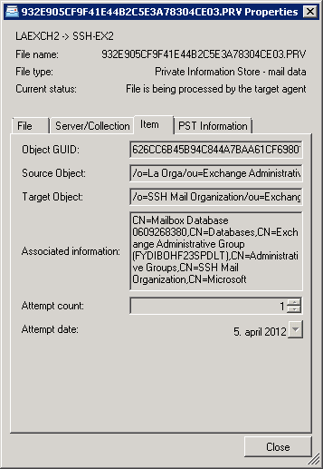 • Associated information — For PRV files, the box displays the full path to the target server mailbox store. For PUB files, the box displays the pair of public folders engaged in synchronization.
