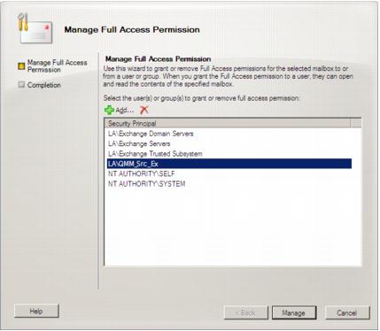 To verify that all permissions for the Source Exchange Account are set correctly, select any mailbox involved in the migration in the Migration Manager Console and check that the Source Exchange Account has Full Access permission for the mailbox.