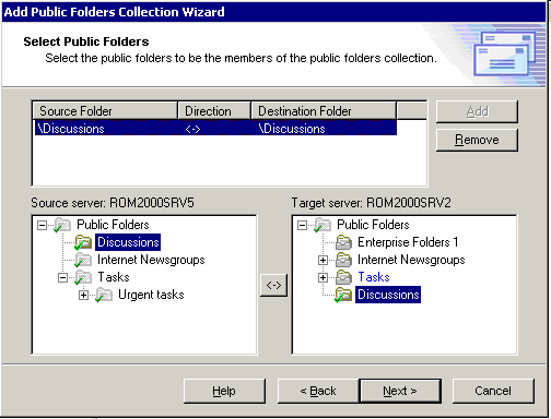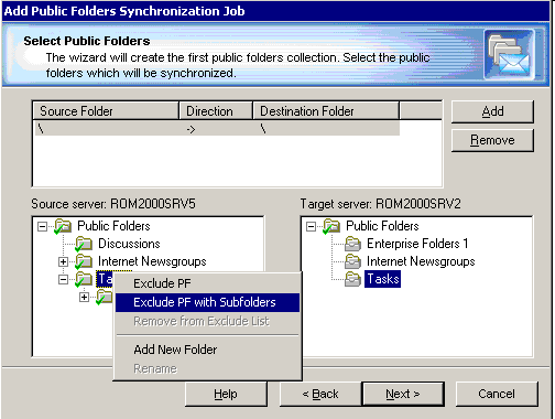 The next step allows you to configure the public folder synchronization collection. Select the root folders to be synchronized. If you don’t want to change the folder hierarchy, the easiest way is to select All Public Folders on both the source and target servers as the synchronization root. Simply select Public Folders in both the Source server box and the Target server box. The wizard will ask if you want to create a Public Folders folder on the target server and synchronize all the source public folders to this folder. Select Yes or No as appropriate.