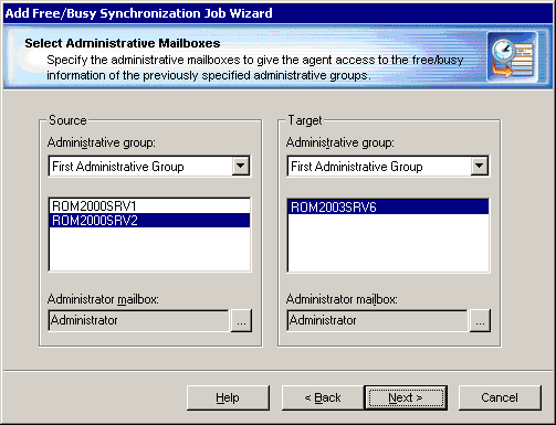 If you want to synchronize the existing target free/busy messages with the source free/busy messages, select the target administrative groups for which free/busy messages should be synchronized.