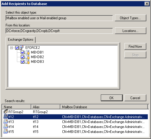 If you do not need to refresh the entire server (which may take some time), you can simply add new recipients to the Migration Manager configuration database. Right-click a server that holds the recipients that should be added and click Add Recipients to Database. In the dialog box that appears, use the search tools to find the recipients you need, and then select them in the Search results list and click OK.