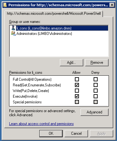 - Set Read(Get,Enumerate,Subscribe) and Execute(Invoke) permission to Allow for service account