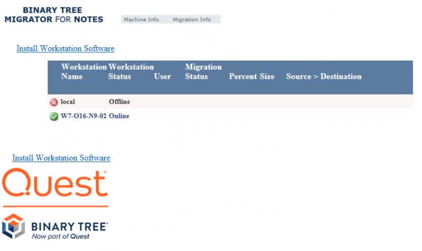 The monitor can be accessed from any machine on the LAN to observe the status of the workstations. The workstation named local is the migration engine installed on the Migration Control Center machine. This should not be used for AWD migrations and should be left as Offline.
