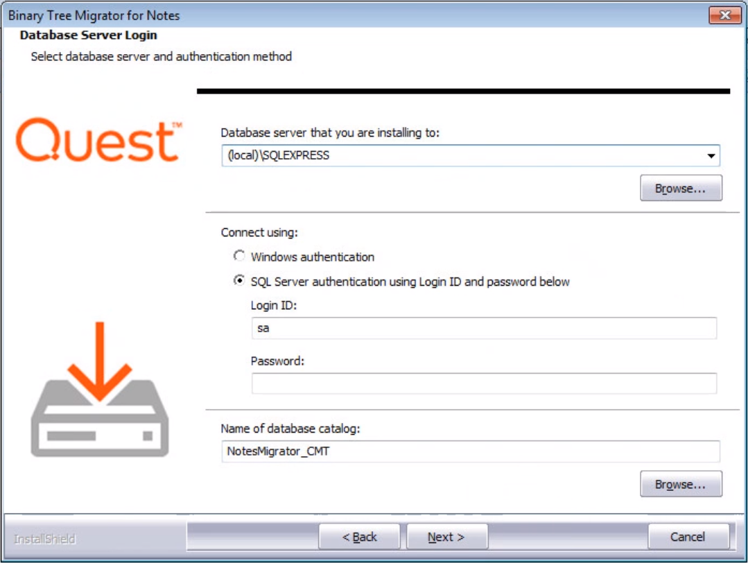 Enter the database server location and the credential information, and then click Next to continue. When SQL Server Express is installed by the installer, the password is set to “Password1” by default: