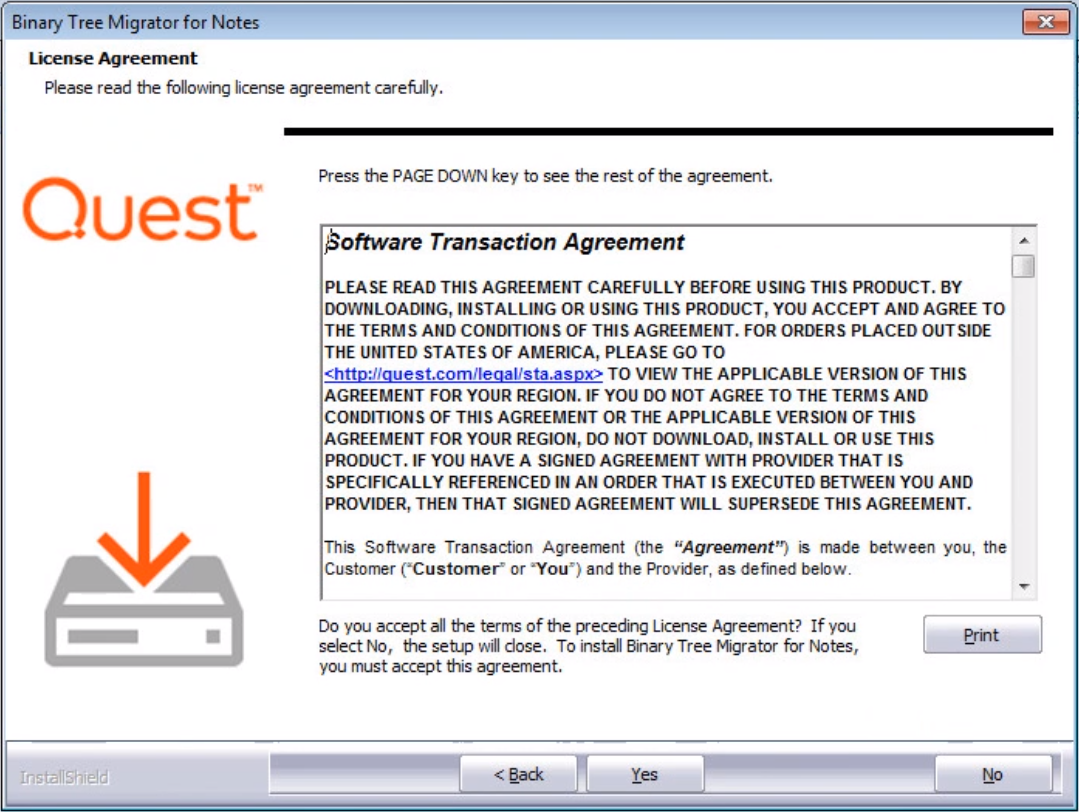The wizard displays the License Agreement screen. Review the License Agreement and accept it; click Yes: