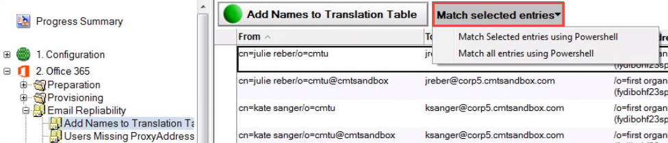 2. Click the Match selected entries using PowerShell or Match all entries using PowerShell drop-down menu option