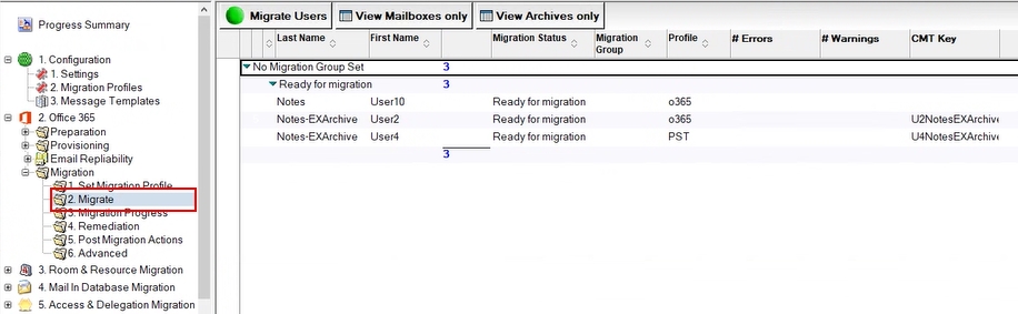 3. Select user(s) that are ready for migration, and then click Migrate Users in the Data Pane