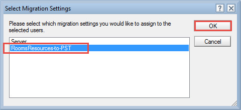 3. Select the migration profile created earlier to migrate rooms and resources to a .pst file and click OK