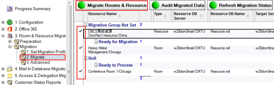 5. Select the room and resources in the Data Pane and click the Migrate Rooms & Resources button