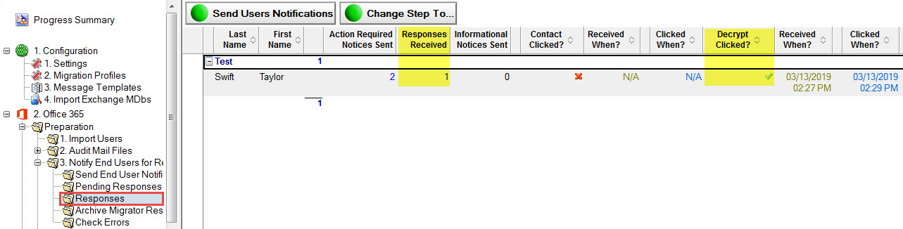 Notifications where users are required to click an embedded button in the email are processed differently. The Migration Message – Windows Decrypt Encrypted Items email template, for example, contains buttons that can be clicked by the user to perform many functions. If users don’t click the buttons, their response is considered pending and is listed in the Pending Responses view.