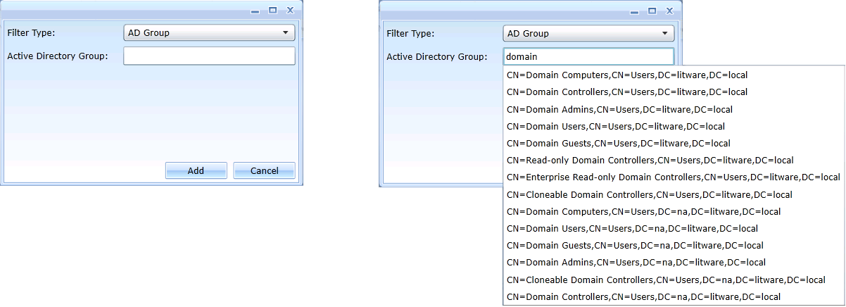 Specify the Filter Type: Custom LDAP Filter, AD Group or Migrator Pro for Exchange Group (an Migrator Pro for Exchange migration group). Then select the query for the group you want from the drop-down list, as shown in the figure above. The new filter will limit the displayed list to contain only mailboxes that satisfy the selected query string.