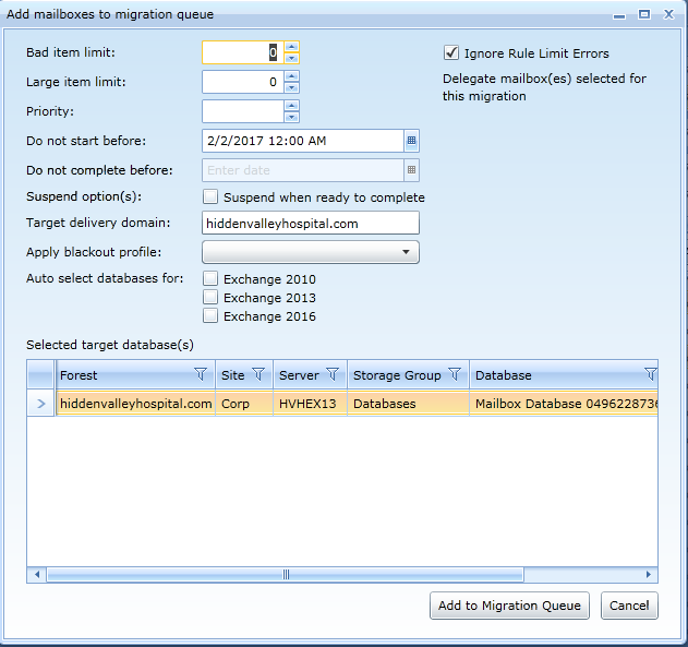From the Add mailboxes to migration queue dialog box, the procedure is the same as for adding mailboxes to Mailbox Jobs. See Adding Mailboxes to the Mailbox Jobs in the Mailboxes topic for information about this process.