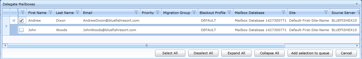 When adding a mailbox to a selection queue by right-clicking it from the Mailboxes view, the Add mailboxes to migration queue dialog box contains a Show Delegates button that lets you add delegate-related mailboxes to the same migration queue.