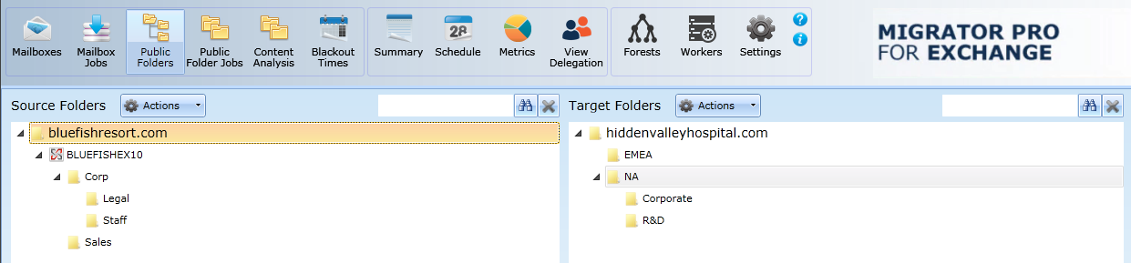 • Click Public Folders in the main toolbar. The screen displays Source Folders on the left side and Target Folders on the right. All items in the Source and Target Folders in this view are periodically refreshed automatically. However, you can manually refresh all items in the Source or Target Folders at any time by clicking Refresh under the Actions menu. Individual items are updated after migrations and can be updated at any time by right-clicking on an item and clicking Refresh.