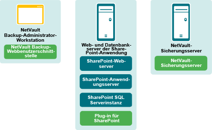 Bei einer Einzelserverbereitstellung befinden sich die SharePoint SQL Serverinstanz, der Anwendungsserver und der Webserver auf demselben Computer oder Server. Das Plug-in wird auf diesem einzelnen Server installiert und führt alle Sicherungen und Wiederherstellungen von diesem Server aus durch.