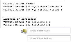 SQL Server 虚拟服务器的 IP 地址:虚拟客户端页面的虚拟客户端地址字段中,输入分配给适当 SQL Server 虚拟服务器的 IP 地址。例如,如果您正在故障转移群集中创建两个 SQL Server 虚拟服务器中的第一个,输入分配给第一个虚拟服务器的 IP 地址。