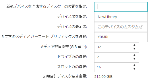 仮想テープのサイズを入力または選択します。メディア・サイズはGiB単位で指定します。各スロットには指定サイズのメディアが含まれます。デフォルト値は、32GiBです。