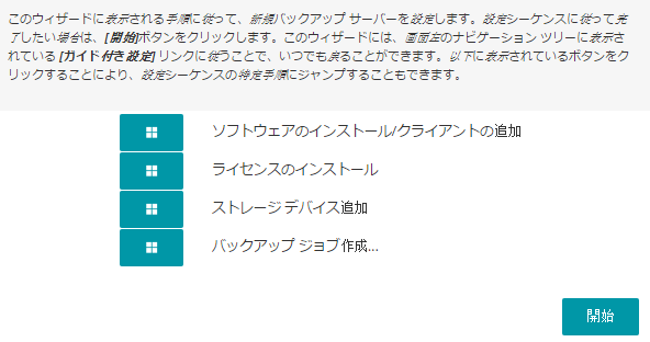 このウィザードは、バックアップ・システムの設定方法を案内しています。ウィザードを使用して、クライアントおよびプラグイン・パッケージのインストール、クライアントの追加、デバイスの設定、ライセンス・キーのインストール、およびバックアップ・ジョブの作成を行うことができます。