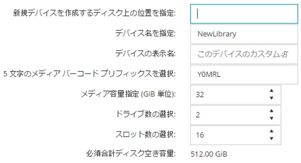 仮想テープのサイズを入力または選択します。 メディア・サイズはGiB単位で指定します。 各スロットには指定サイズのメディアが含まれます。 デフォルト値は、32GiBです。